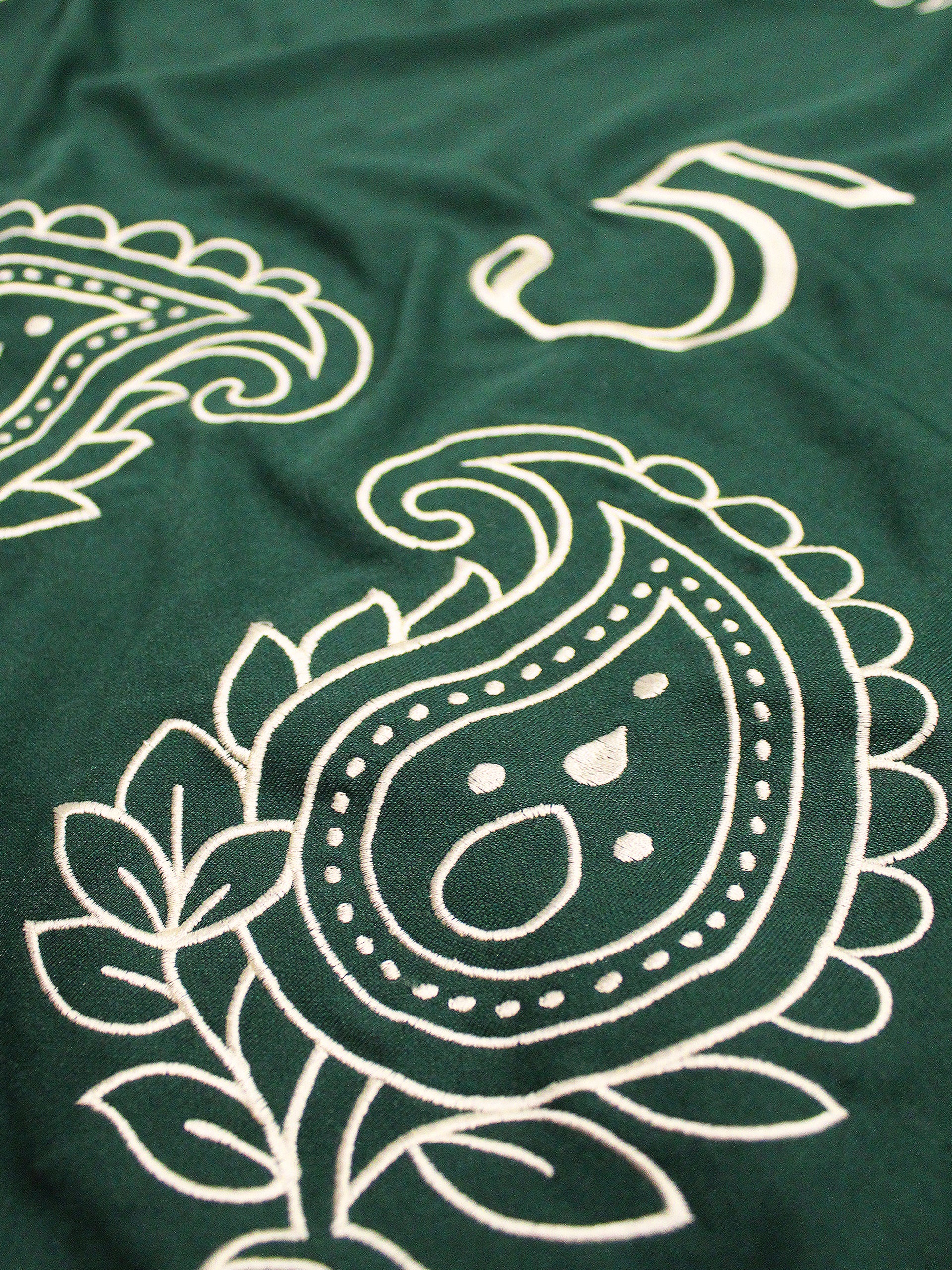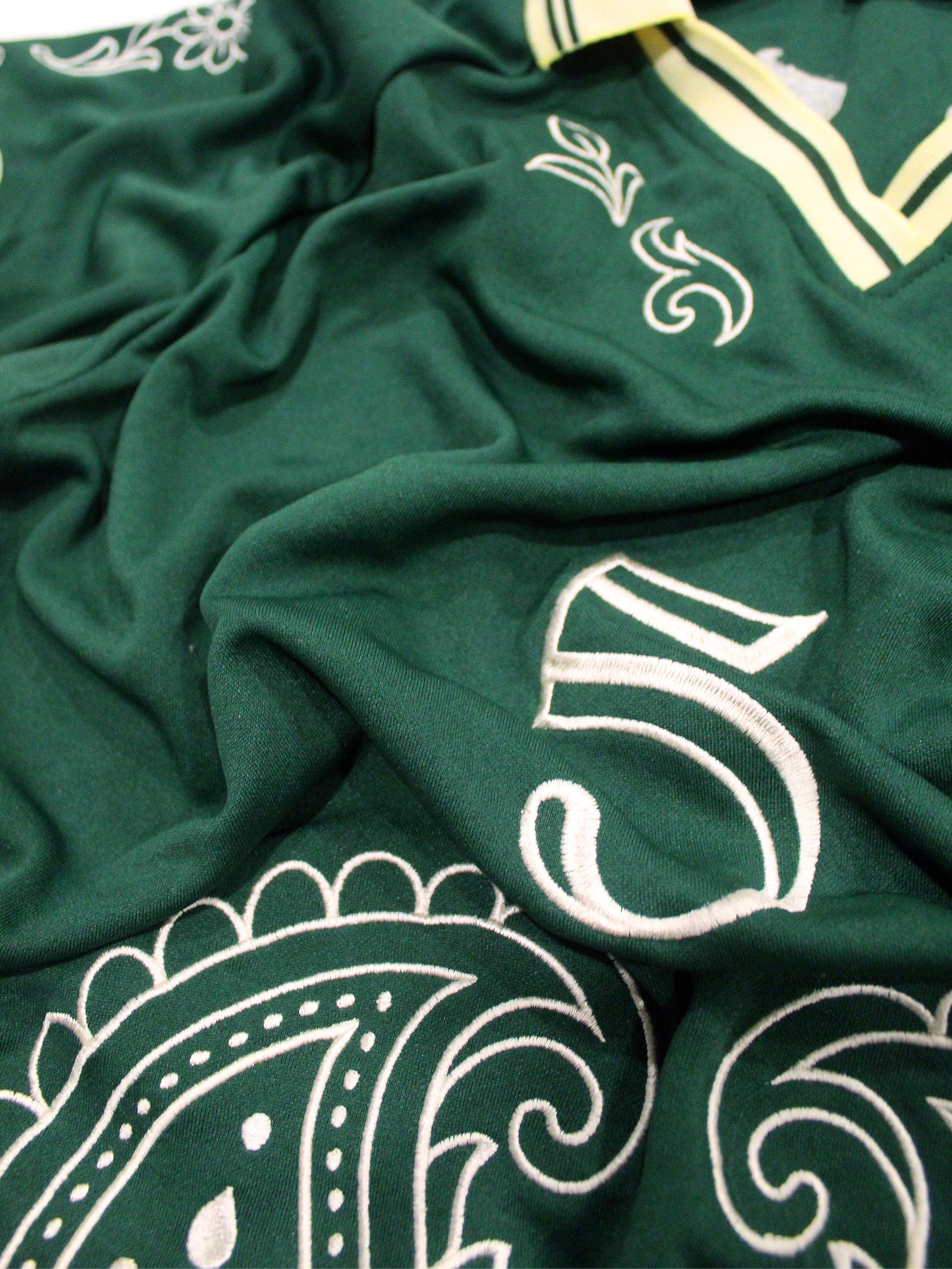 Using design notes of truck art and Pakistani art motifs, florals, and paisleys, here's our ongoing series of Soccer Jerseys with a different spin using all over embroidery art that identifies with us.