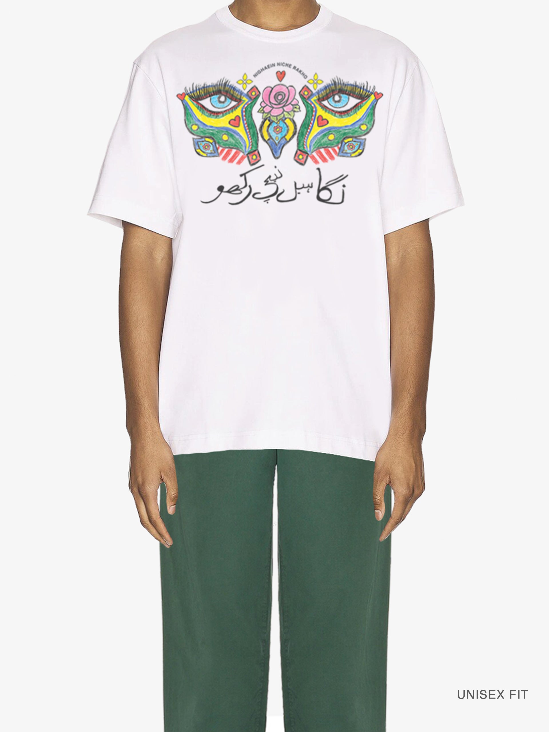 Pakistani folk art continues as a form of expression for the people, preserving traditions, and provides a sense of identity for Pakistan, despite the modernization of Pakistani art. This tee’s print is hand drawn, influenced by truck art, and uses a poetic line as often seen in folk art.