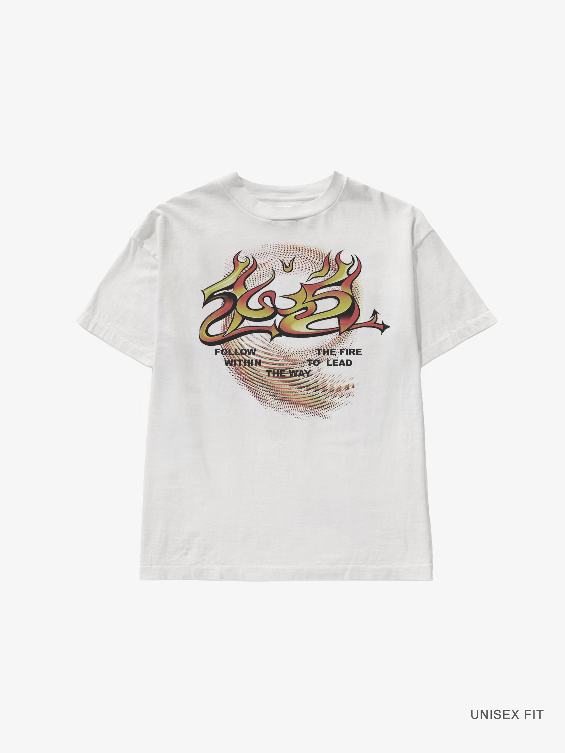 This poetic tee uses flame design elements and calligraphy to remind us to follow our passions within and use that light from the fire to help lead us through everything we do.